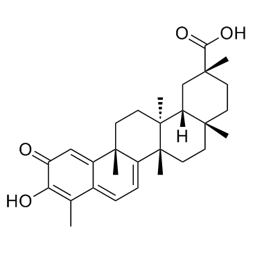 用Tripterin(Celastrol)(1-3mg / kg /天,腹膜内注射,1-31天)治疗携带PC-3肿瘤的裸鼠导致肿瘤生长的显着抑制(65-93%)[1]。用3和6 mg / kg Tripterin(Celastrol)治疗后,丙二醛(MDA)水平分别显着下降35.2%和36.7%(P <0.05)。用3和6mg / kg Tripterin(Celastrol)治疗显着恢复GSH水平(P <0.05)至几乎正常水平[2]。