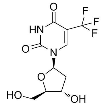 Trifluridine是不可逆的胸苷酸合酶抑制剂,从而抑制DNA合成。 Trifluridine是用于单纯疱疹病毒 (HSV) 感染的抗病毒药物。