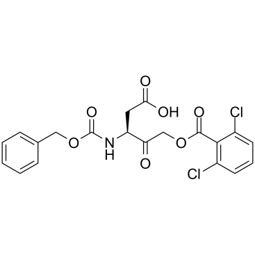 Z-Asp-CH2-DCB 是一种不可逆的广谱 caspase 抑制剂,Z-Asp-CH2-DCB 也能抑制具有 caspase 样活性的蛋白酶。Z-D-CH2-DCB 并以剂量依赖的方式阻断 PBMC 细胞中的金黄色葡萄球菌肠毒素 B (SEB) 刺激的 IL-1β、TNF-α、IL-6 和 IFN-γ 的产生,和降低 SEB-1 刺激的 T 细胞增殖。Z-Asp-CH2-DCB 可预防 SU5416 诱导的间隔细胞凋亡和肺气肿的发生。