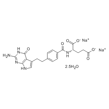 Pemetrexed disodium hemipenta hydrate 是一种叶酸拮抗剂 (antifolate)。抑制胸苷酸合成酶 (TS),二氢叶酸还原酶 (DHFR) 和甘氨酰胺核苷酸甲酰转移酶 (GARFT),Ki 分别为 1.3 nM,7.2 nM 和 65 nM。