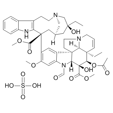 Vincristine sulfate是一种抗肿瘤长春花生物碱,抑制有丝分裂纺锤体中的 microtubule 形成,导致中期阶段的分裂细胞停滞。 它与 microtubule 结合的 Ki 为85 nM。
