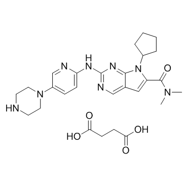 LEE011 succinate 是一种高度特异性的 CDK4/6 抑制剂,IC50 值分别为 10 nM 和 39 nM,对 cyclin B/CDK1 复合体的活性低于其 1000 倍。