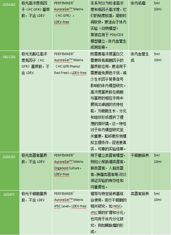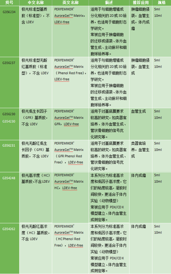 PERFEMIKER? AuroraGelTM 系列基质胶同时推出AuroraGelTM Matrix(HC GFR Phenol Red Free),LDEV-free基质胶,为既需要高浓度蛋白又需要降低细胞因子的基质胶应用提供解决方案,更适用于需要避免颜色干扰、减少生长因子背景信号影响的体内模型研究。高浓度基质胶在细胞与基质的相互作用中展现出卓越的支持性能,为细胞生长、分化和组织形成提供了理想的微环境。这一特性对于体内模型研究至关重要,能够更好地模拟生理条件,促进更真实、可靠的实验结果。目前该系列基质胶,进口品牌没有对应产品。
