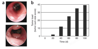 内窥镜肿瘤调研。通过迷你腔镜监测AOM诱导的肿瘤形成情况。a)还能用于纵向研究;b)对于肿瘤负荷分析,每只小鼠的肿瘤大小按照预设的时间点记录并做总和。